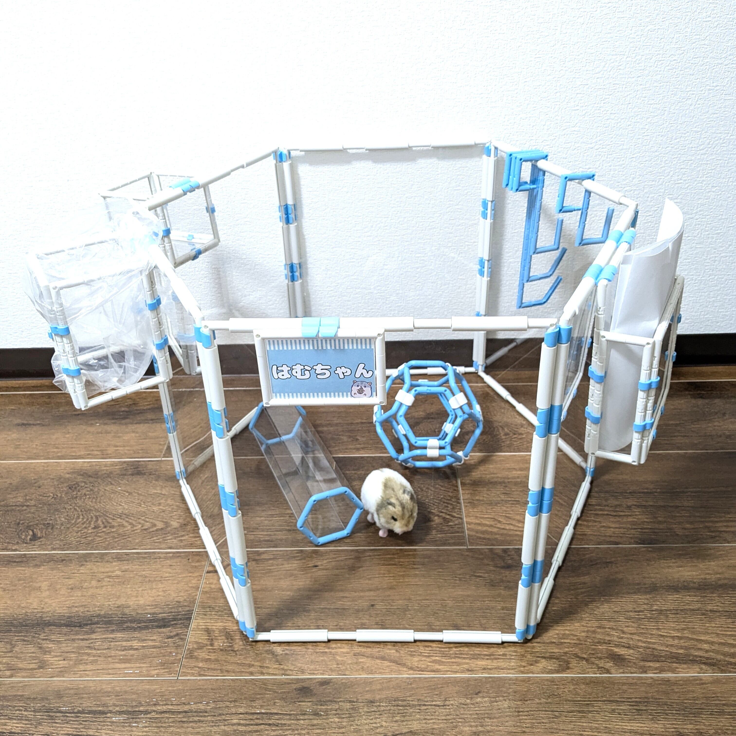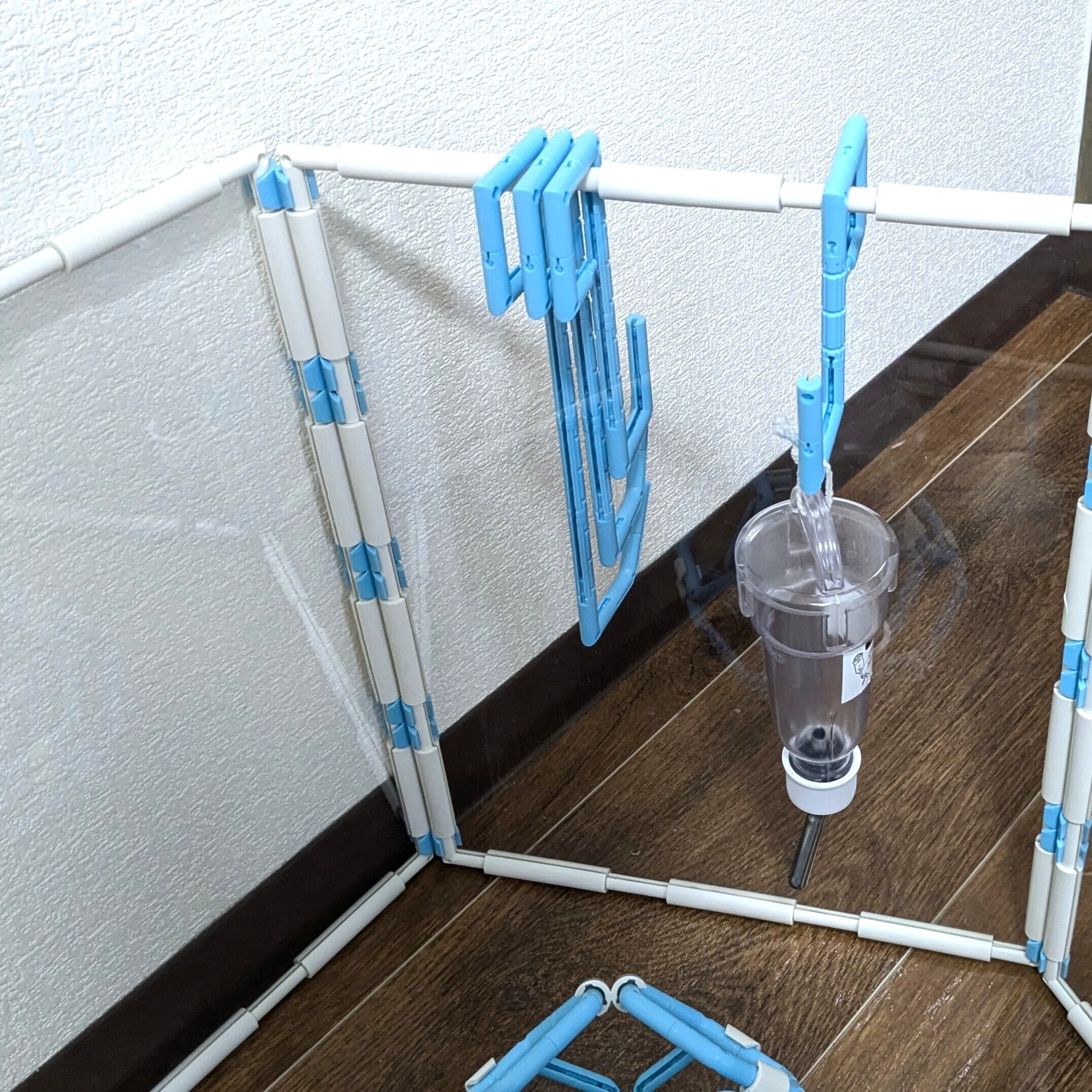 小物や水飲み器、おもちゃなどを吊るすことで、床面を広く使え、サークル内をすっきり整えることができます。