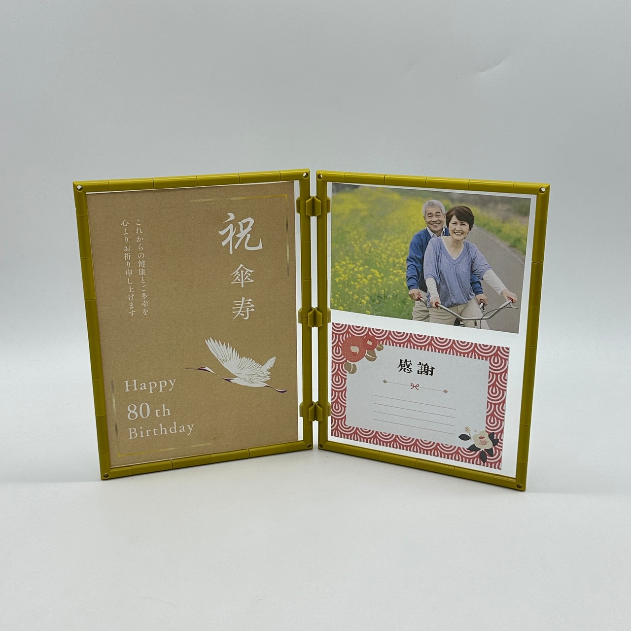 長寿の慶びを表す黄色をあしらった、傘寿のお祝いにふさわしいフレームです。
