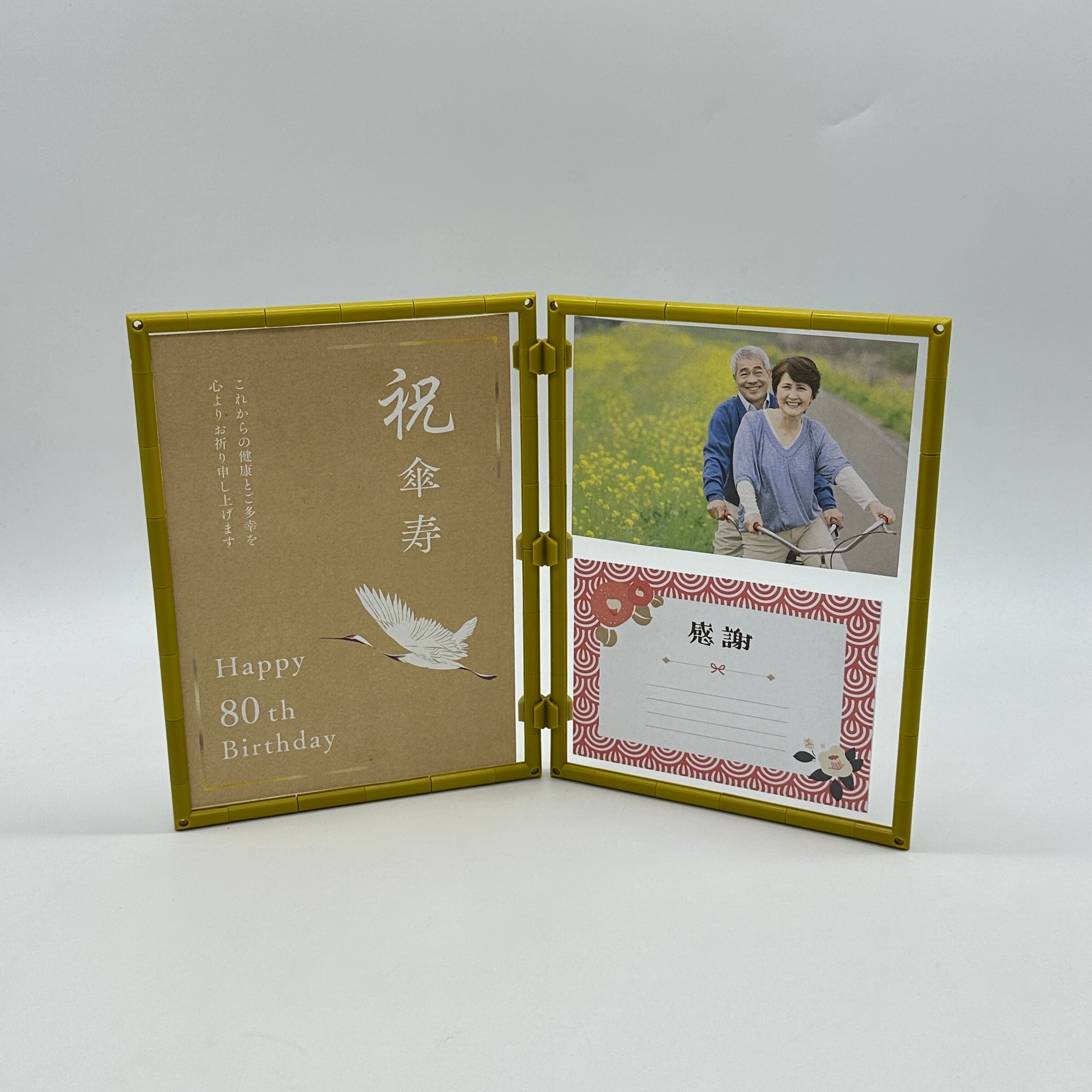 片側には「お祝い台紙」、もう片側には写真やメッセージを入れられる2面仕様。ご家族の写真や感謝の言葉を添えれば、世界にひとつの贈り物に仕上がります。