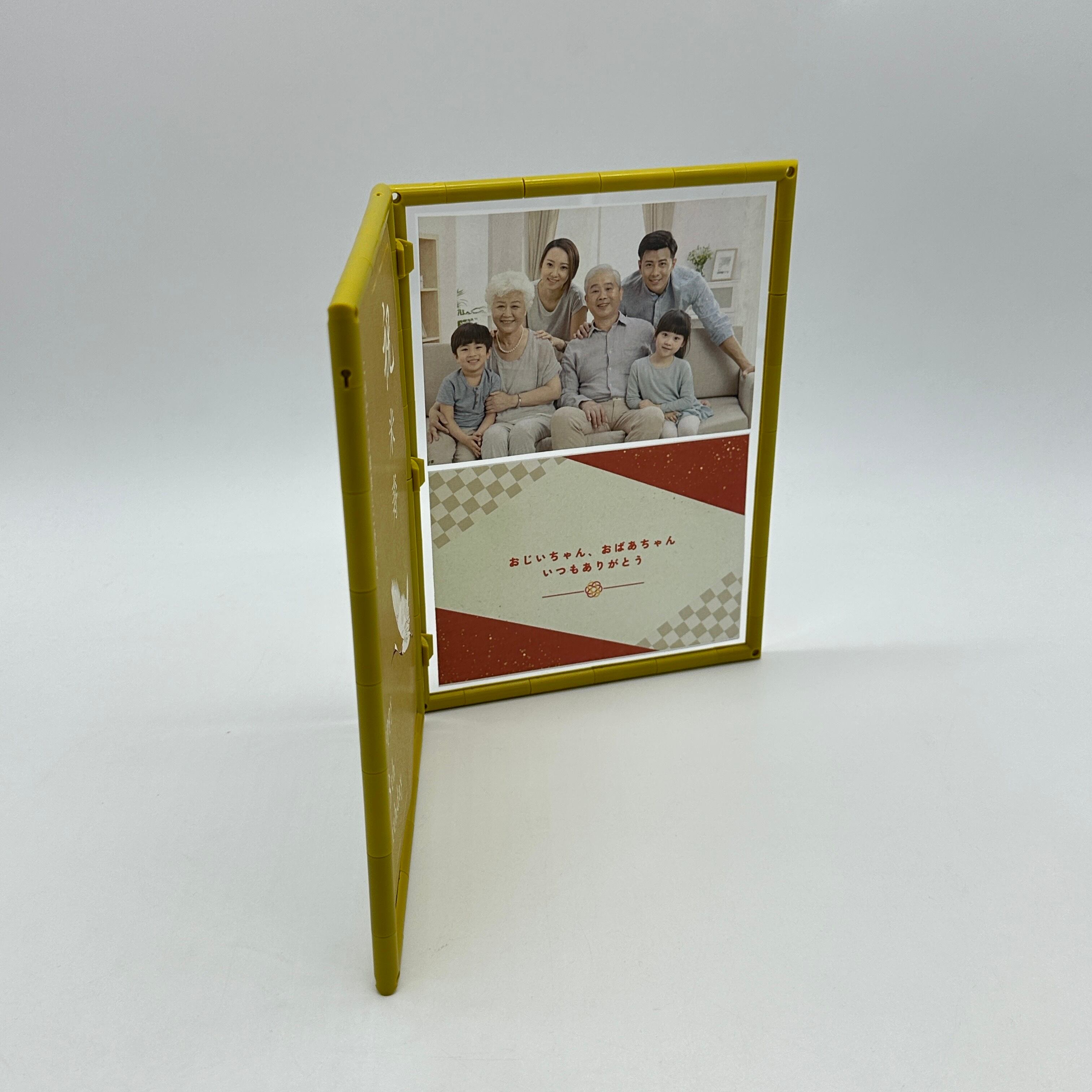 片側には「お祝い台紙」、もう片側には写真やメッセージを入れられる2面仕様。ご家族の写真や感謝の言葉を添えれば、世界にひとつの贈り物に仕上がります。
