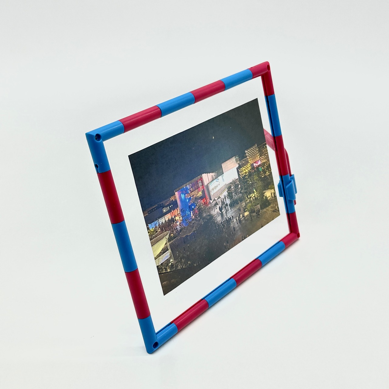 赤と青のブロックを組み合わせてつくる、L判写真がぴったり収まる実用的な大きさのフォトフレームで、お気に入りの一枚をきれいに飾ることができます。