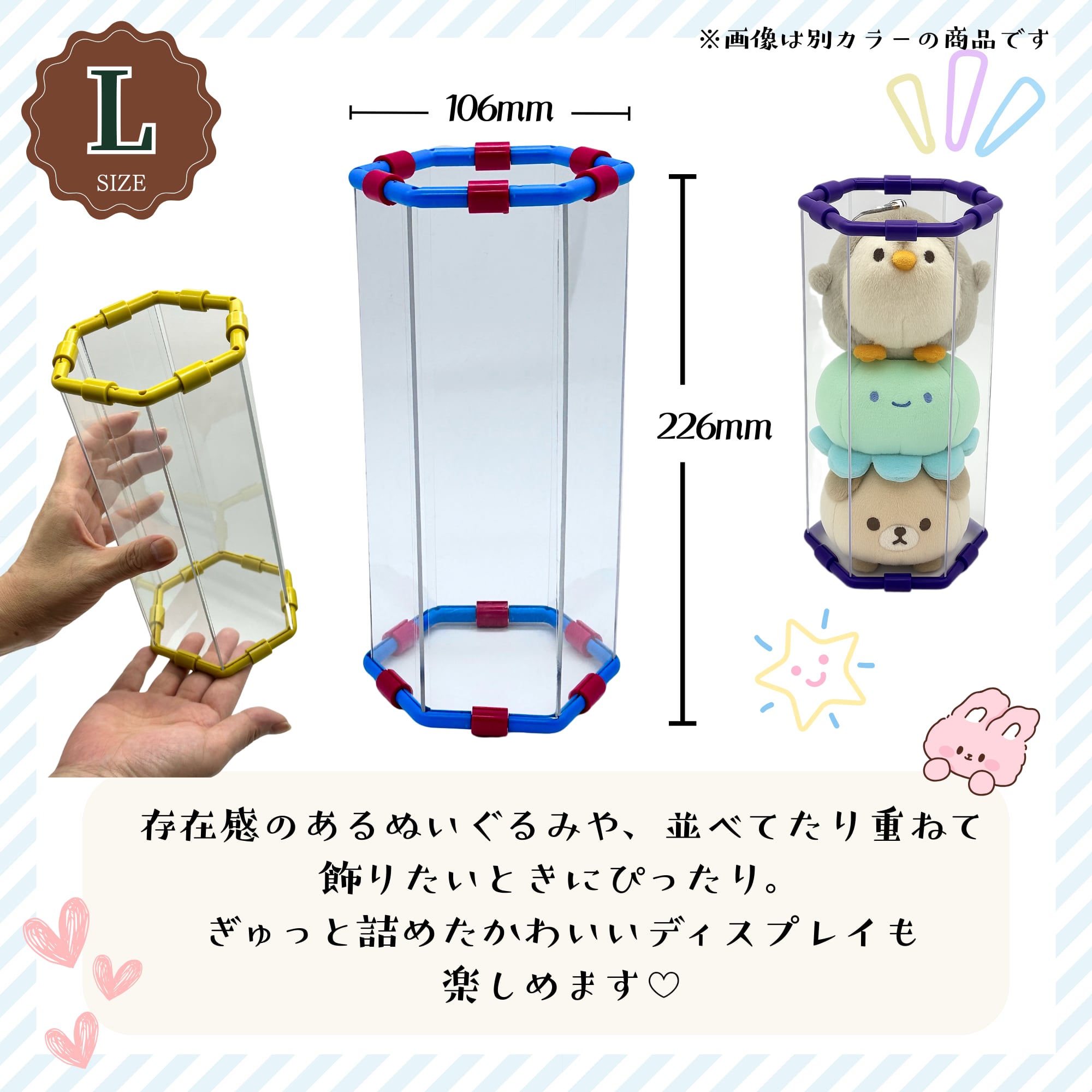 存在感がありながらも、透明チューブと調和し、ぬいぐるみの魅力を引き立てます。