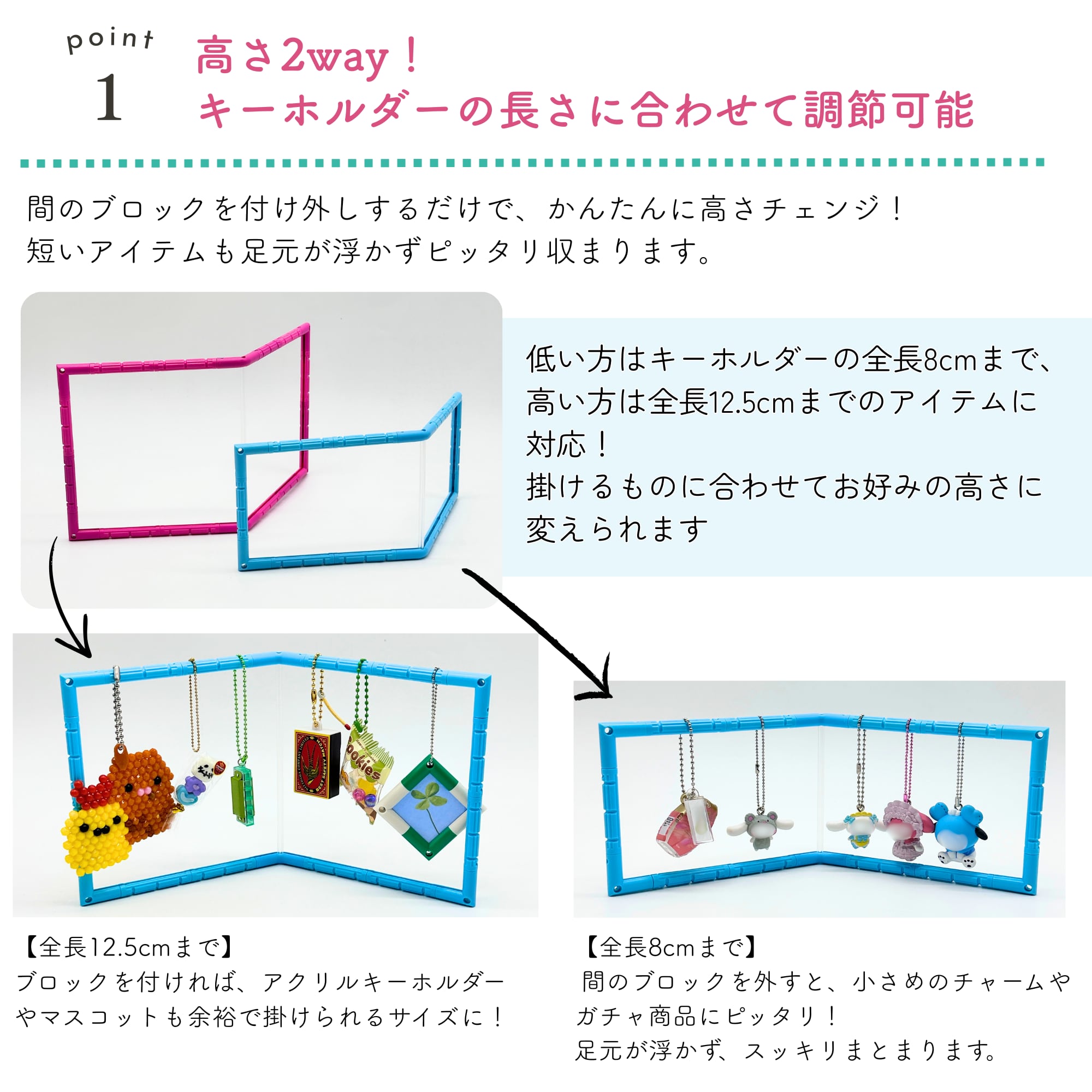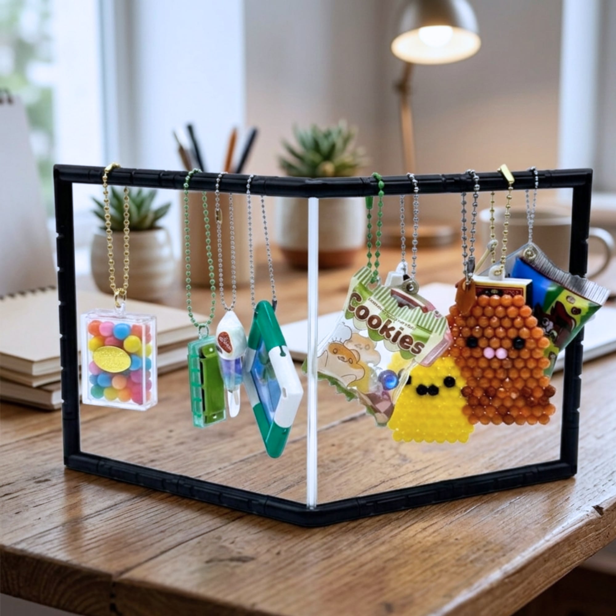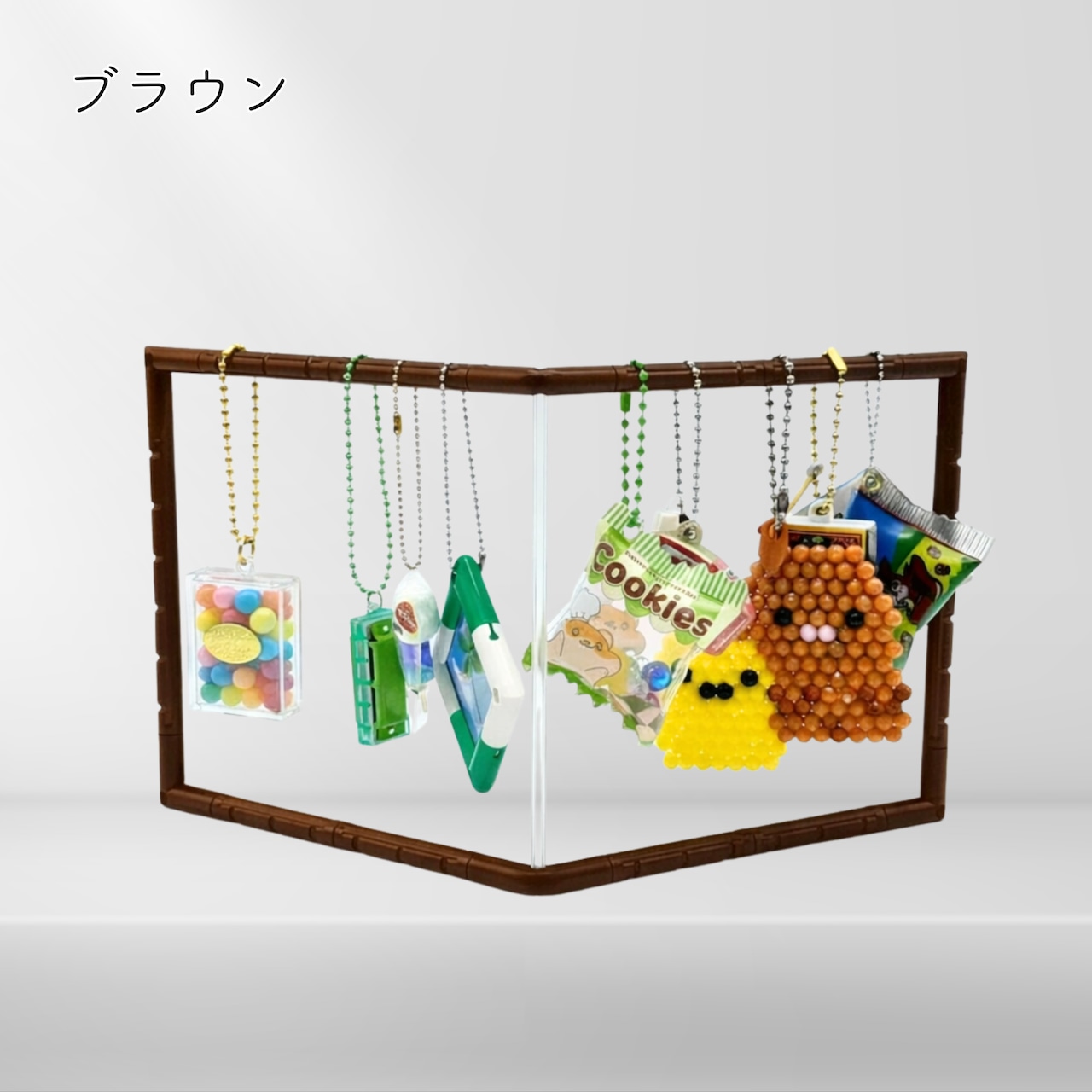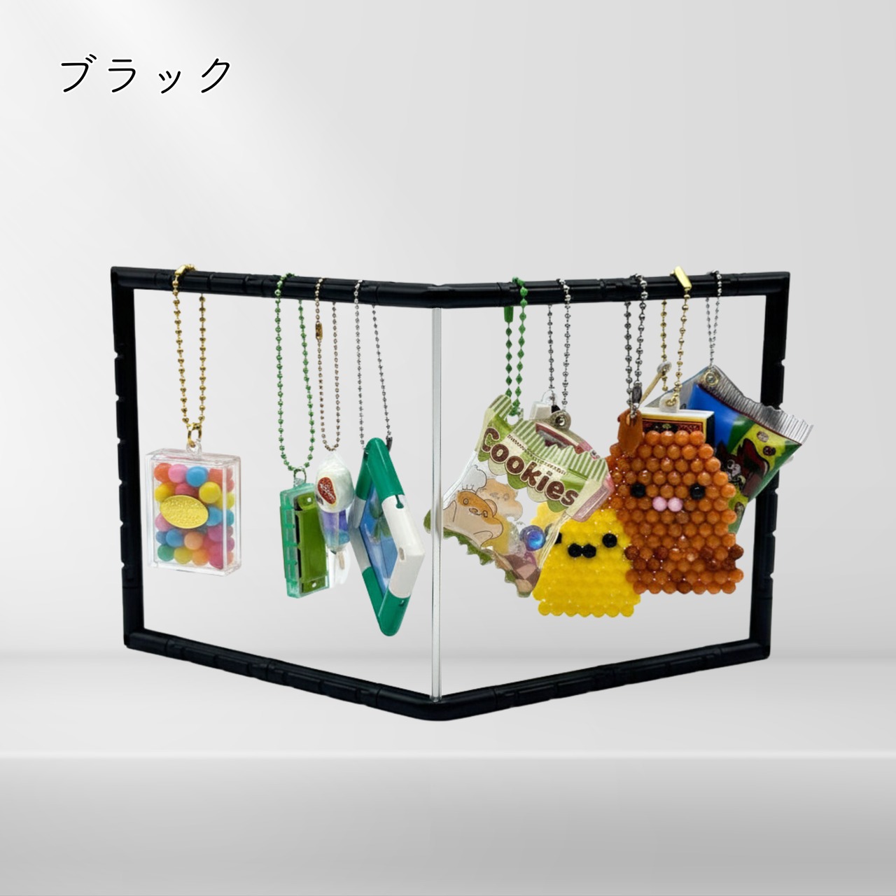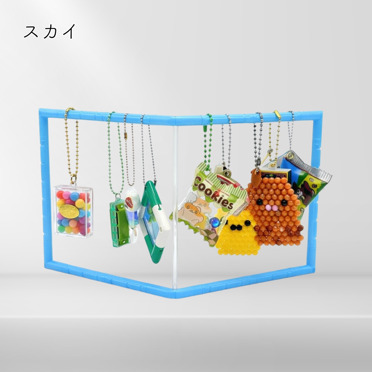 ガチャガチャのフィギュアキーホルダーから、ラバーストラップ、マスコットキーホルダーや小さなぬいぐるみまで、まるでお店のようなディスプレイが完成します。