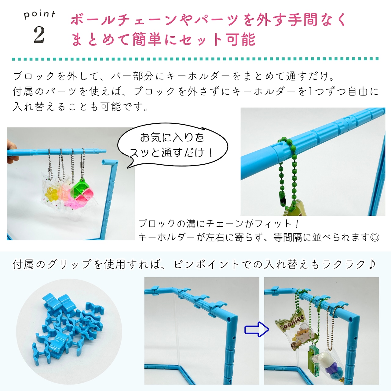 ブロックを1か所だけ外してスッと通すだけで、お気に入りが一列に。さらに、付属のグリップを使えばピンポイントでの入れ替えもラクラクです。
