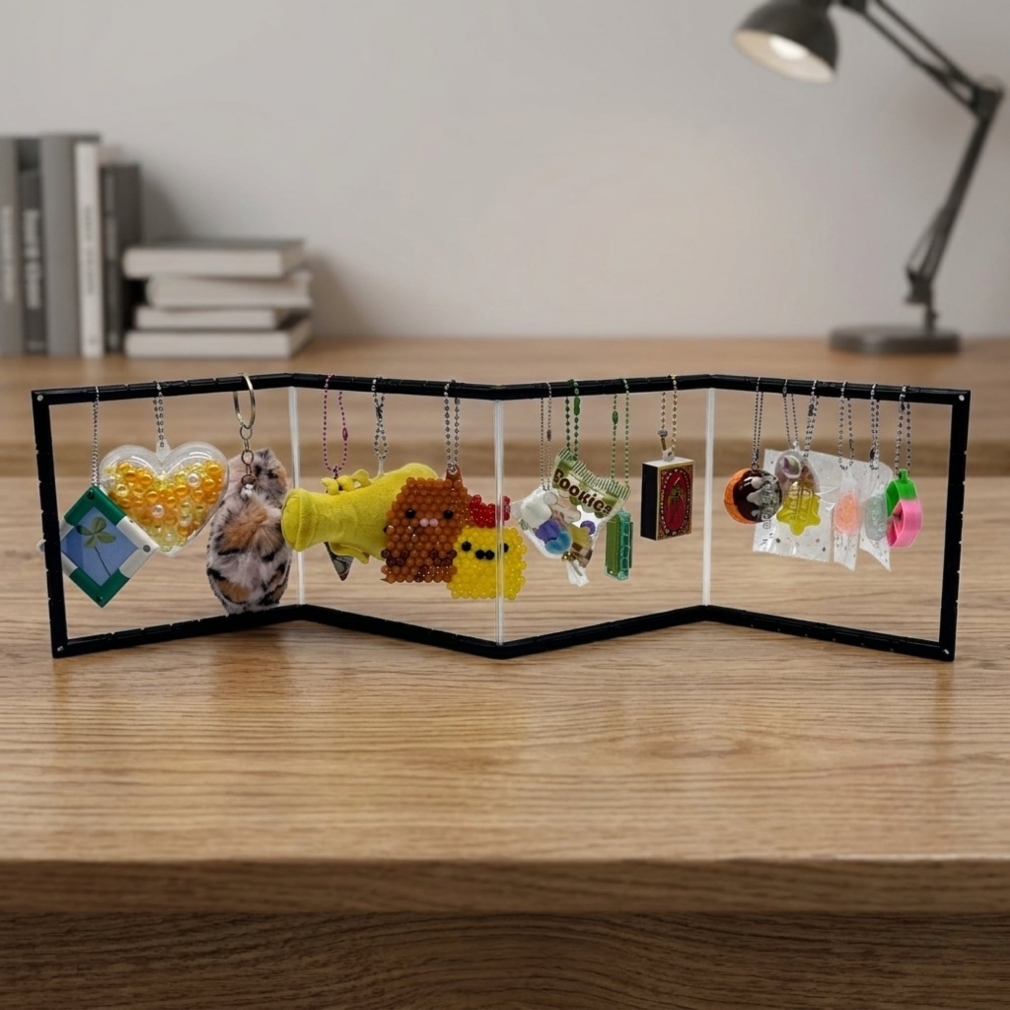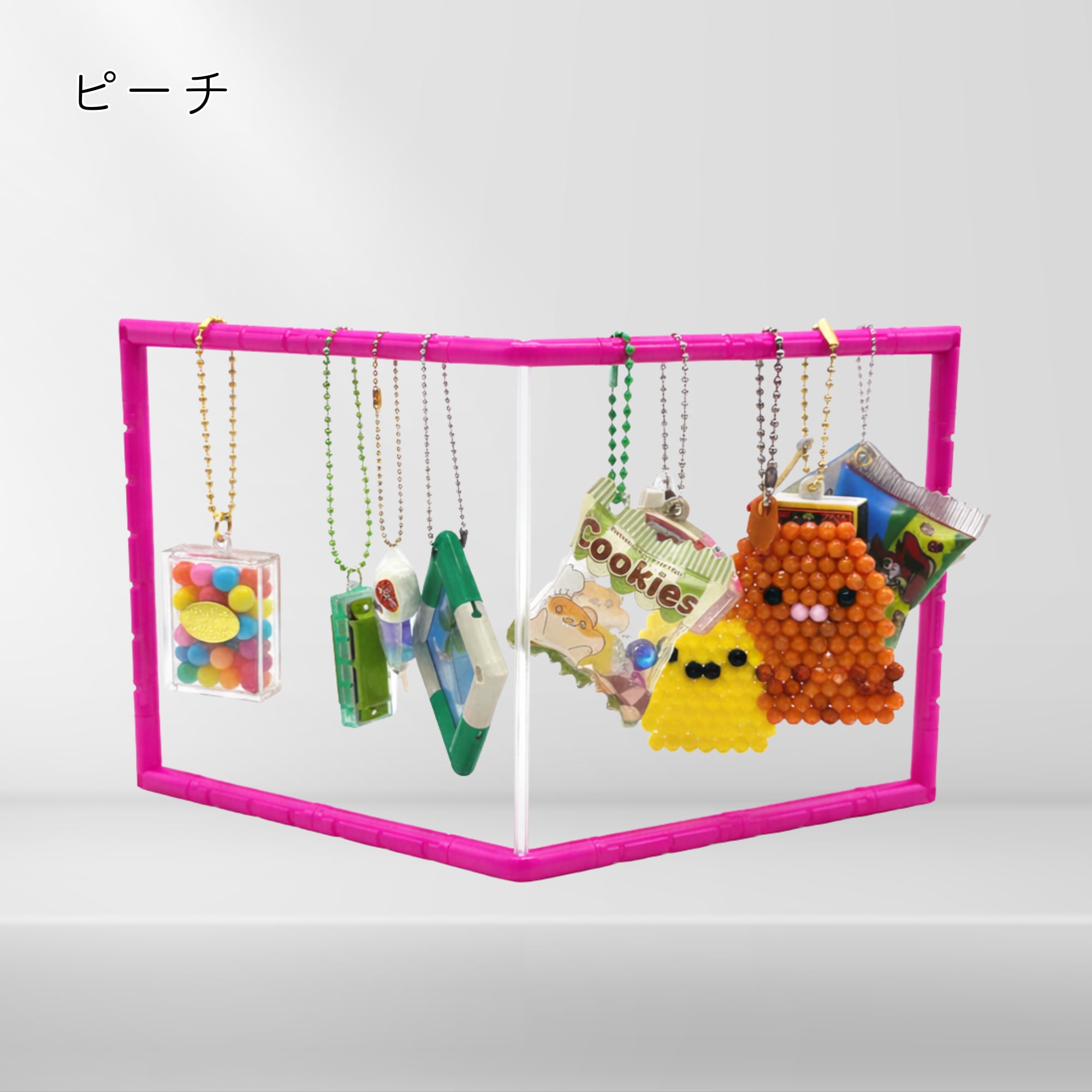 ガチャガチャのフィギュアキーホルダーから、ラバーストラップ、マスコットキーホルダーや小さなぬいぐるみまで、まるでお店のようなディスプレイが完成します。