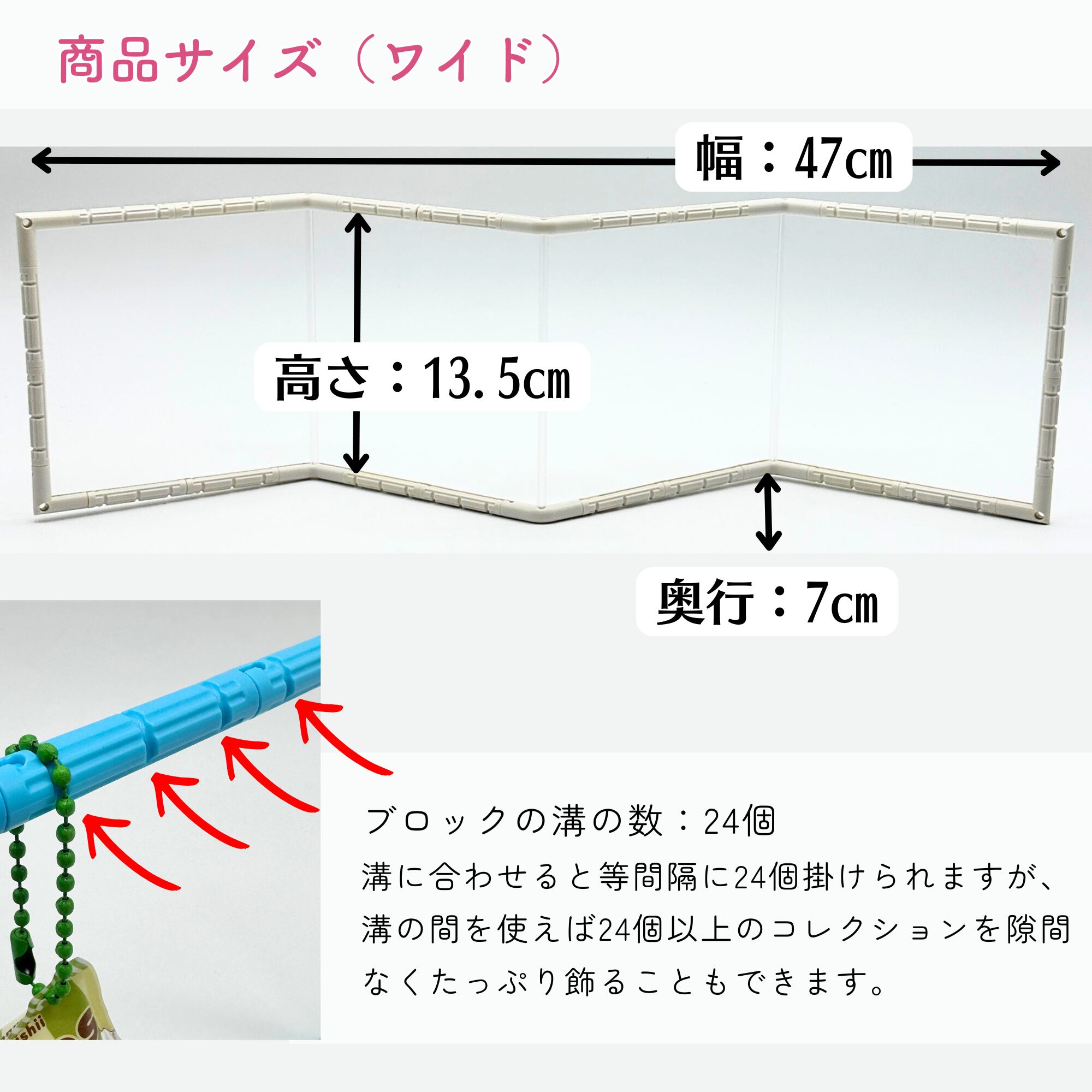ブロックを1か所だけ外してスッと通すだけで、お気に入りが一列に。さらに、付属のグリップを使えばピンポイントでの入れ替えもラクラクです。
