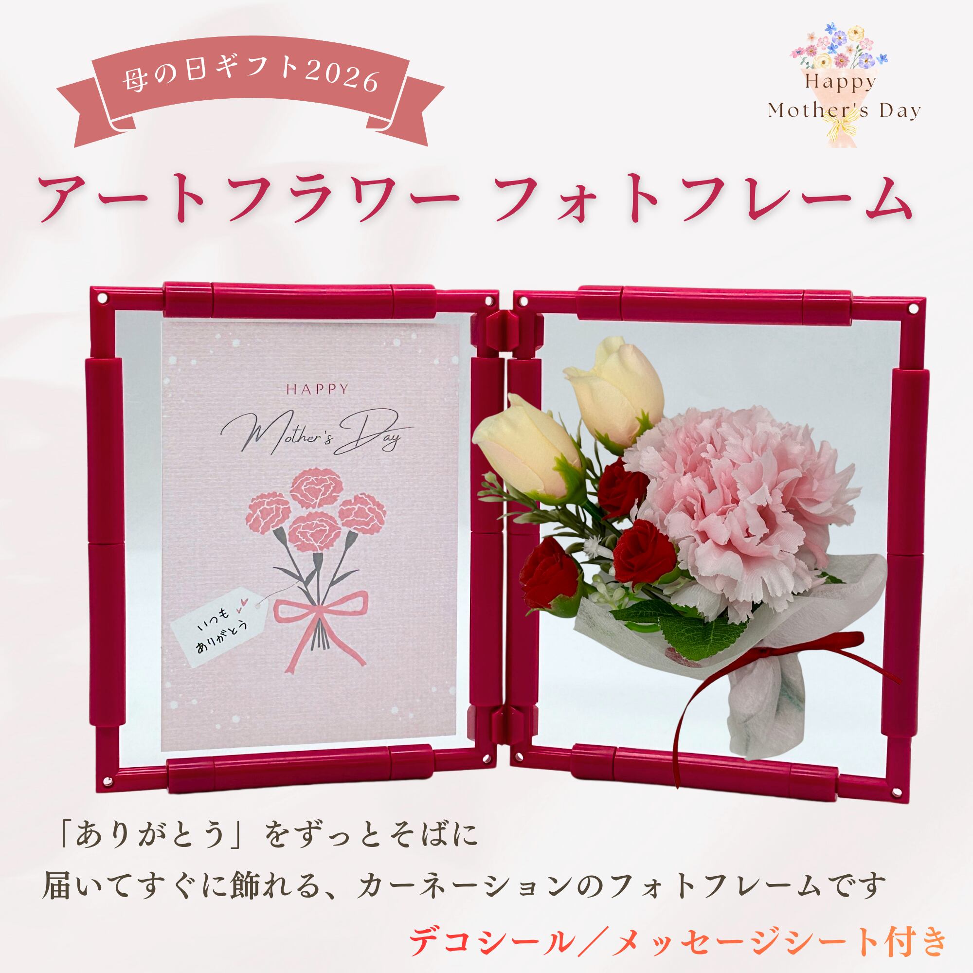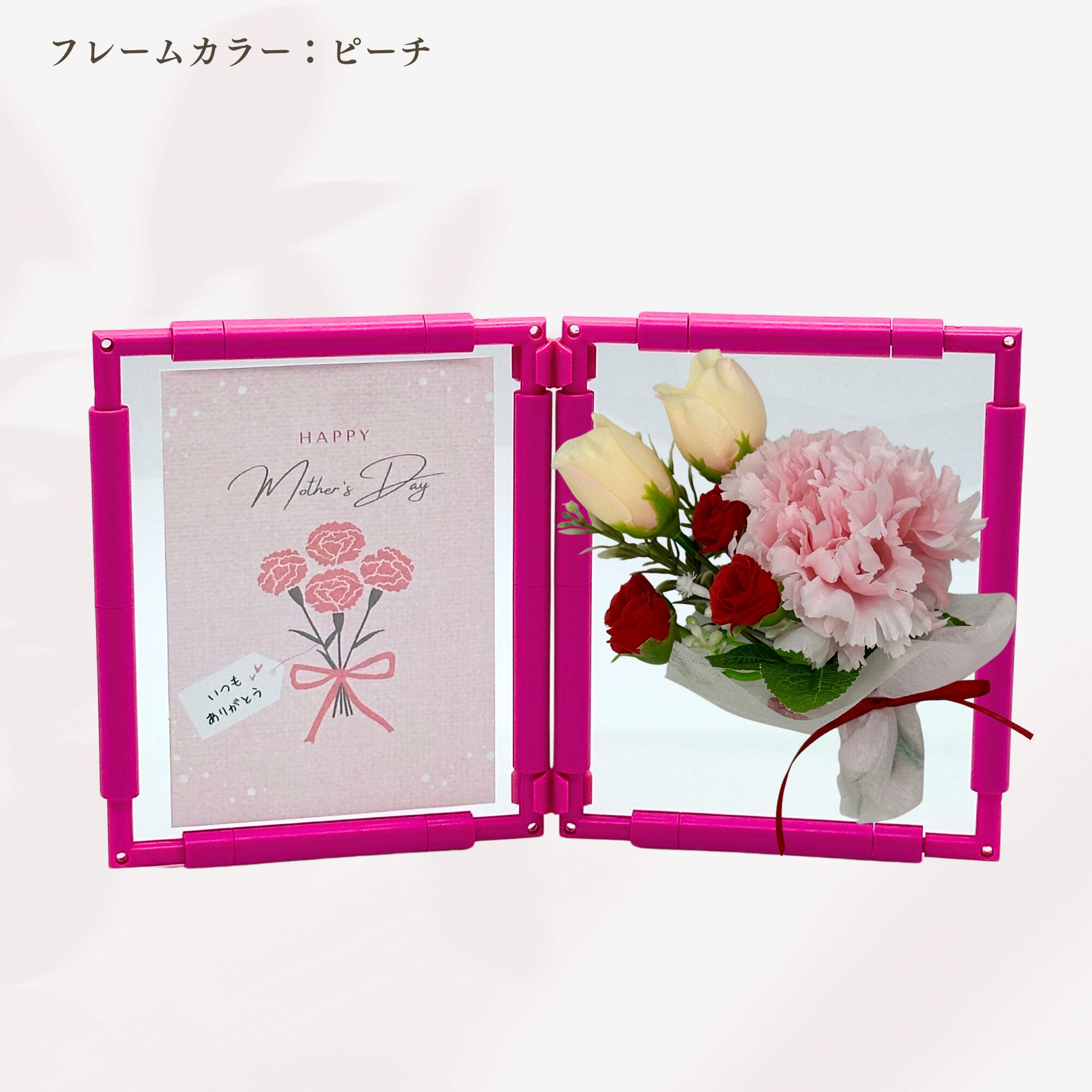 母の日専用の台紙とメッセージカードがセットになった、届いてすぐに贈れるカーネーション花束付きのフォトフレームです。
