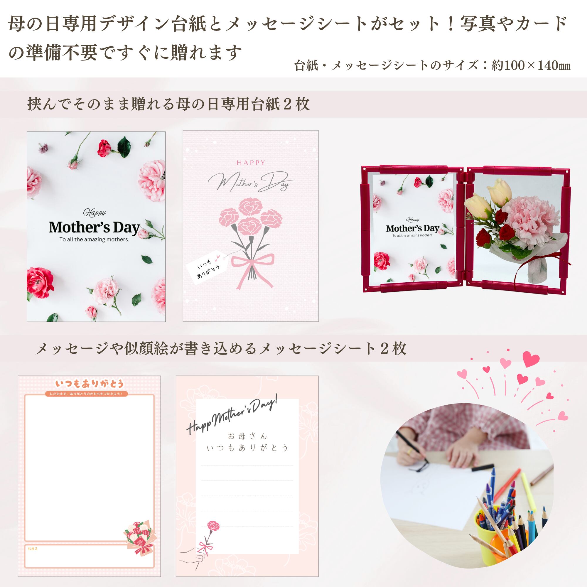 母の日専用のメッセージカードとデザイン台紙がセットなので、写真や手紙を用意しなくてもそのまますぐにお母さんへ感謝を届けられます。