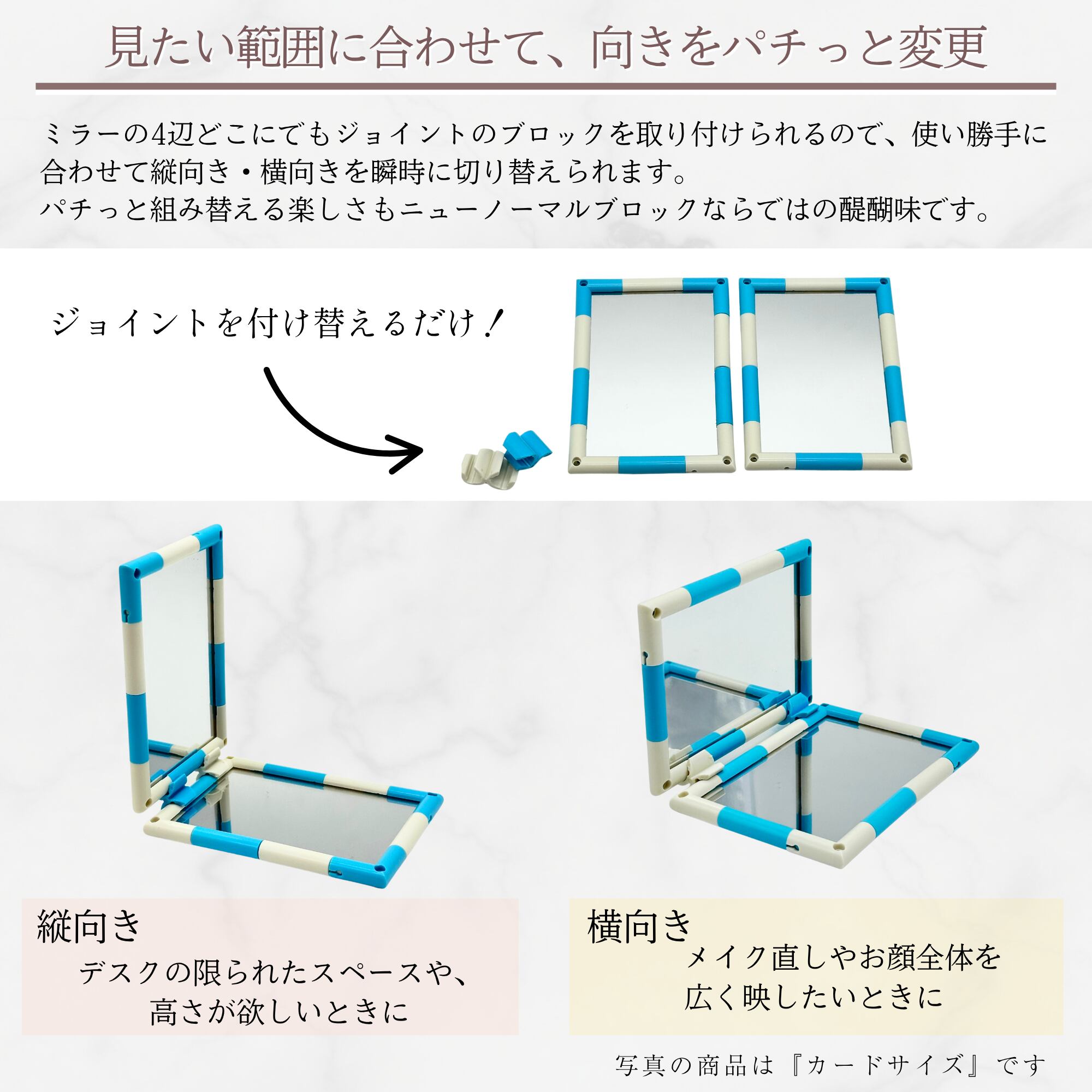 2面セットのミラーは、ブロックを外せば1面ずつの独立したミラーとして使用可能。ポーチに入れて持ち運んだり、友人とシェアしたり、シーンに合わせて形を変えられます。