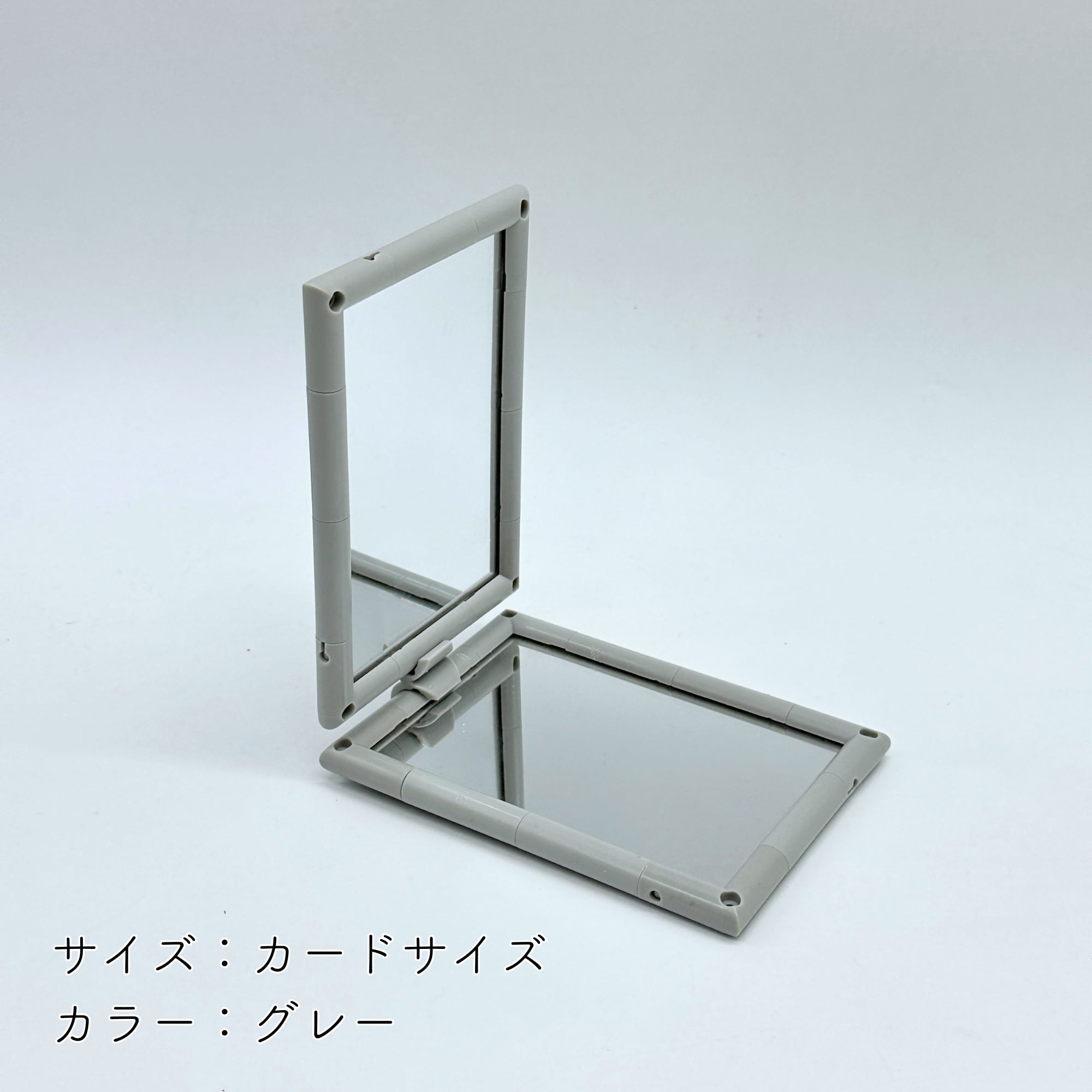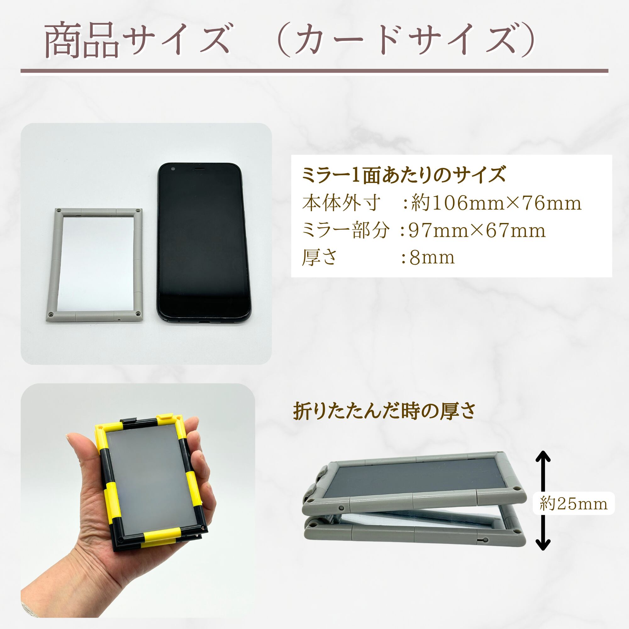 手のひらに収まるミニサイズ(3×6cm、6cm角)、お顔全体を映しやすいカードサイズ(7.5×10.5cm)をご用意。用途に合わせて最適なサイズをお選びいただけます。