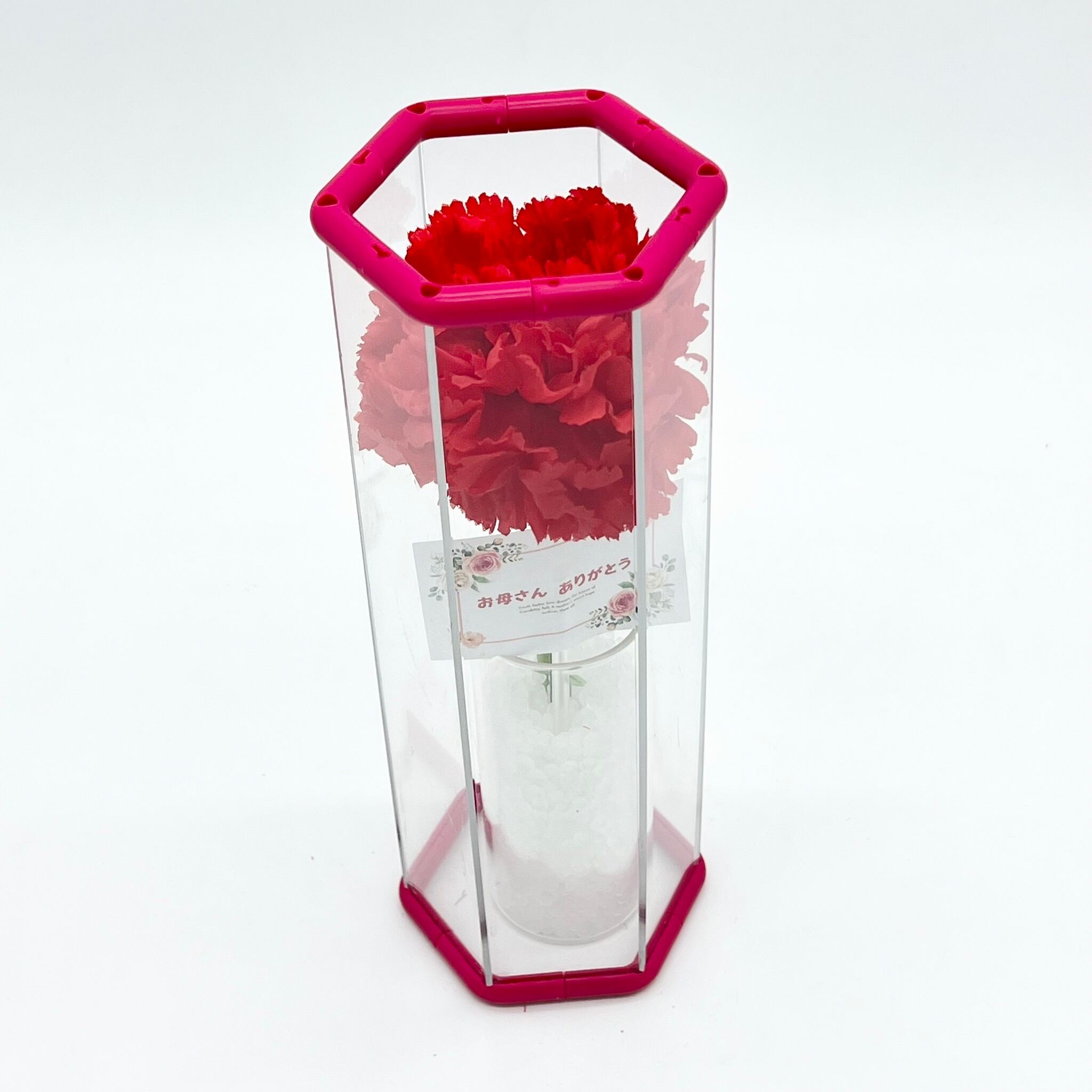 母の日にお母さんに感謝の気持ちを伝えるのに最適な造花と、花器・チューブ・メッセージカードのセットです。
