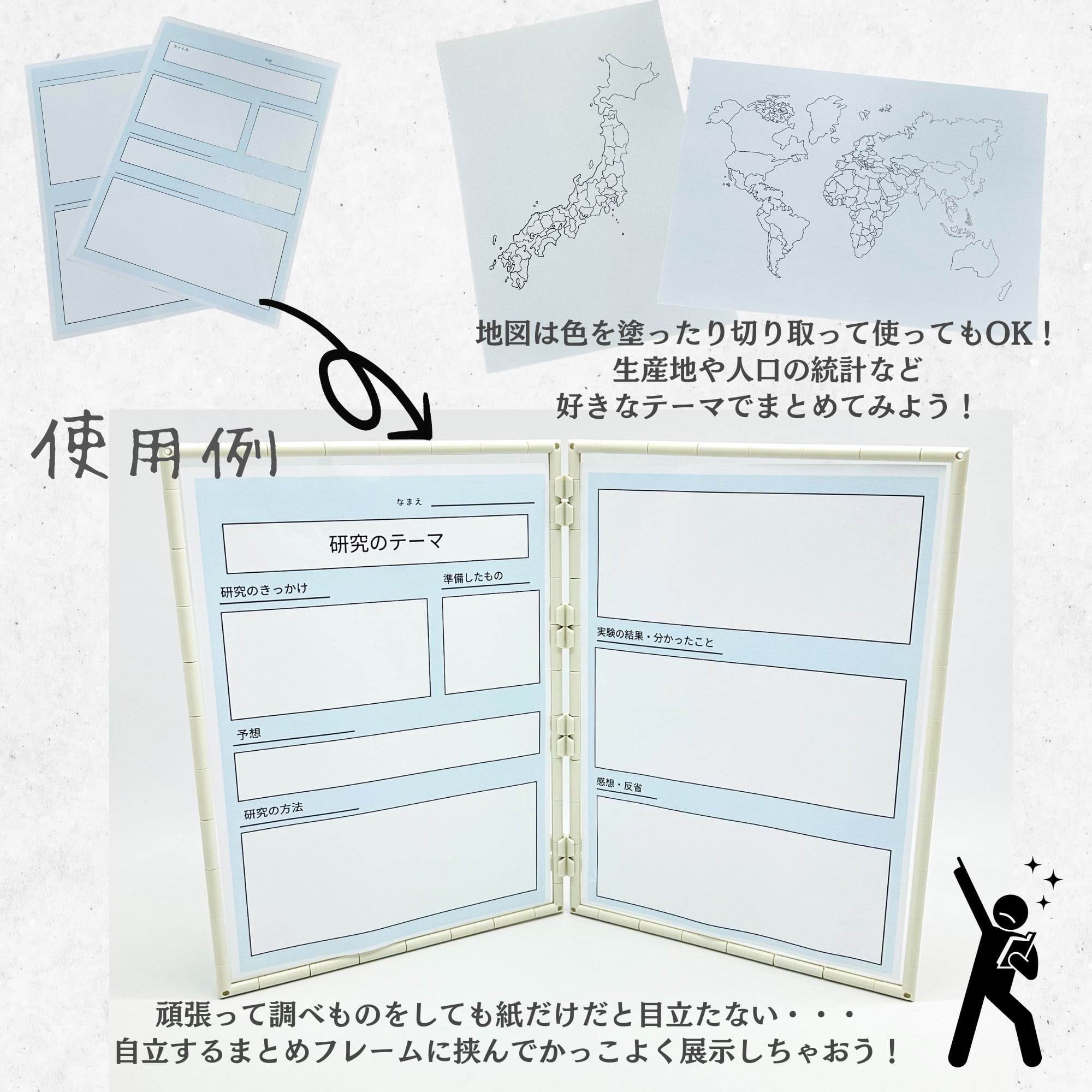 A4サイズの観察日記や調査結果を美しくまとめられる学校の発表や展示にもピッタリなデザインで、自分で作った作品を飾ることができます。